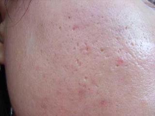 2、凹凸型痘坑:主要以囊肿为主,瘢痕比较宽,一般在5mm左右,可达到皮下脂肪层,使皮肤凹凸不平。